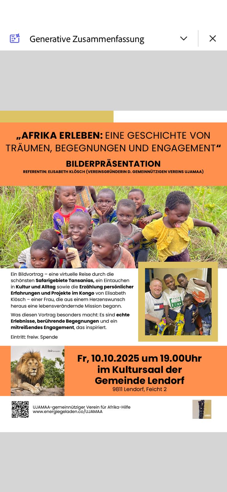 Wir besuchten die Bilderpräsentation “Afrika erleben: Eine Geschichte von Träumen, Begegnungen und Engagement” im Kultursaal Lendorf, 10.10.2025, mit der Referentin Elisabeth Klösch, Vereinsgründering Gemeinnütziger Verein UJAMAA!