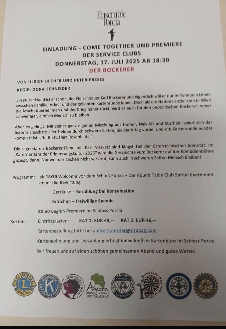 Wieder trafen sich die Service Clubs aus dem Bezirk Spittal, Round Table, Ladies Circle, Agora, Club 41, Soroptimisten, Business Power, Kiwanis, Lions & Rotary, gemeinsam zu einer Premiere